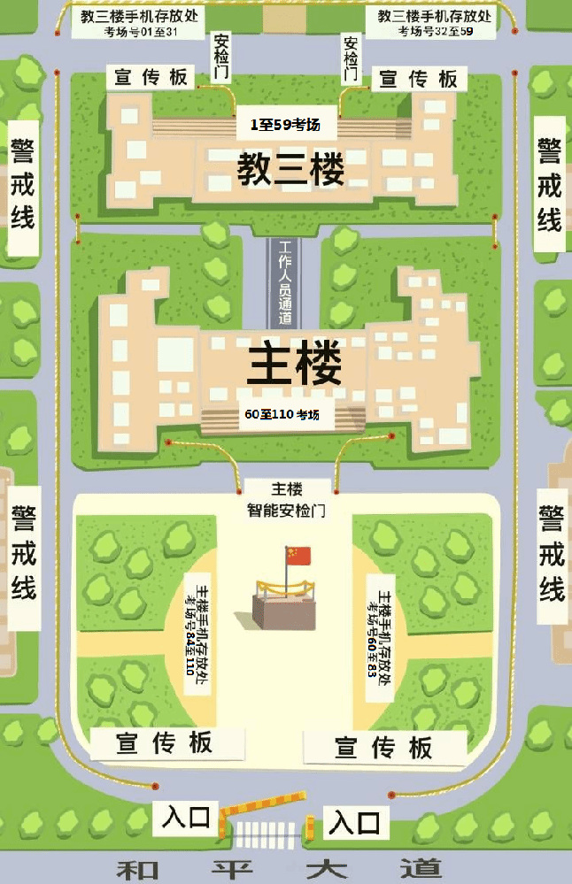 1—59号考场设在教三楼;60—110号考场设在主楼。