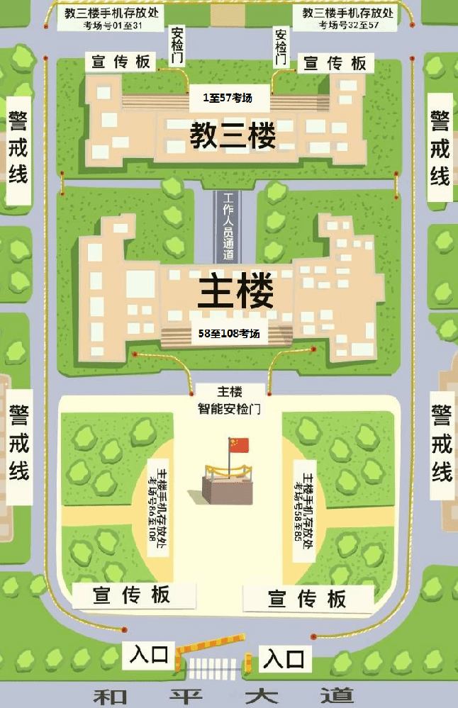1.考生统一从和平大道东南门(一号门)专用通道进出校园,行程途中按指示牌、工作人员指引路线到达考点大楼。考试结束后考生按工作人员的指令保持人员间距有序离场。