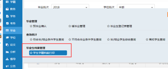 1、选择“毕业”模块中,“学生学籍档案打印”。(图1)