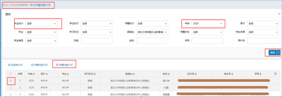 2、“毕业批次”选择“全部”,“学位批次”选择“全部”,“学籍批次”和“年级”选择需要打印的年级(2020年3月入学新生即选择“2020”),勾选需要打印《新生入学登记表》的学生点击“学籍档案打印”。(图2)