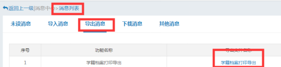3、在导出消息中查看并点击蓝色的“学籍档案打印导出”即可下载word版本的《新生入学登记表》(图3)。请站点下载后打印2份下发给学生贴好照片、填写承诺书等空白部分并回收。