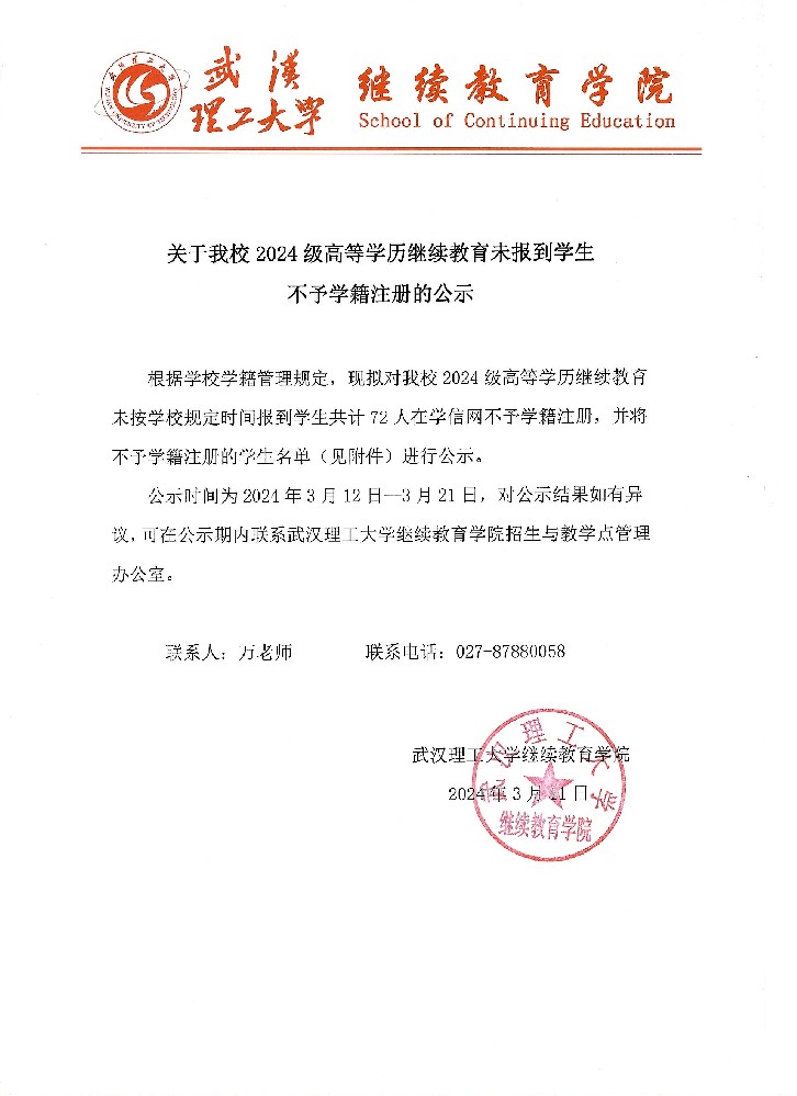 武汉理工大学成人教育-关于我校2024级高等学历继续教育未报到学生 不予学籍注册的公示