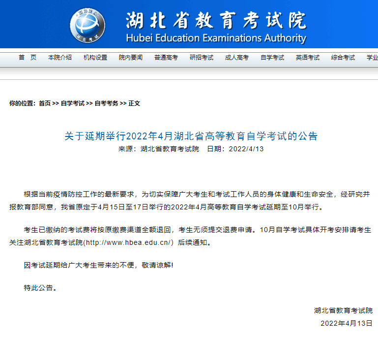 关于延期举行2022年4月湖北省高等教育自学考试的公告