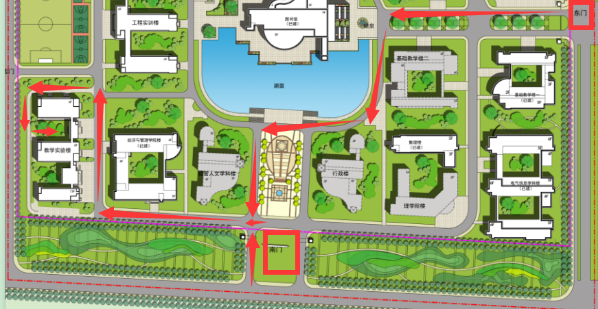 2. 考生持有效居民身份证和考试通知单进入校园。我校考场设在在敏行楼,校园内有地贴和志愿者引导考生前往敏行楼,敏行楼位置如下图,请考生看清考试通知单上的楼栋信息。